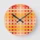 This clock has a geometric design of lines in shades of red and yellow woven to make a plaid.