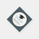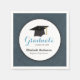 This graduation paper napkin features a graphic of a graduation hat (mortarboard) and customizable text for the year, graduate's name, and name of their school. The background is blue denim.