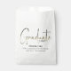 This design features a graduation grad party favour bag, graduation cap mortar board gold, high school or college senior, custom personalised name class of, a trendy stylish calligraphy script font, graduation grad party supplies, simplistic contemporary modern design, treat cookie bar dessert gift, doggie bag to go dessert, graduation party treat bag