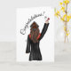 Graduate with brown hair in black cap and gown holding a diploma fashion illustration on a greeting card. Cute card for senior students. Perfect card for female graduates of high schools and colleges. Great card for graduation gifts. Give this special card to your sister, friend, or girlfriend. It demonstrates a big accomplishment.