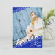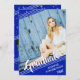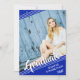 Simple, clean white lines against a royal blue background and muted stars with a brush script title "Graduate" and graduation year accent your graduate's name and four of their photos (one full-bleed diagonal on the front and three diagonally on the back). The back features the same diagonal lines design, stars pattern, three photos and your graduation party invitation details on a royal blue background.