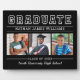 Classic 3 photo graduation plaque display sign with easel features Graduate in bold serif lettering with modern custom text that can be fully customised with the graduate's full name, class year, and school name. Add three favourite pictures of the graduate to the square placeholder images. Black background colour can be modified.