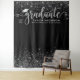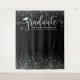Elegant graduation party backdrop sign celebrates your grad in style! Design features a grad cap, "Graduate" in modern faux silver foil script, and modern custom text that can be personalized with the graduate's name, class year, and school. Includes a border of sparkling silver and white confetti. White text, cap, and black background colors can all be modified.