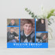 This design features a photo collage, with a graduate graduation multi-photo collage, with a QR code for Facebook social media event page URL. a simple minimalist grad party minimal, with a 5 five-photo grid template, for high school or college seniors, an azure blue and white colours, a white text picture photo layout, with your school colour navy blue theme, a classic classy grad party invitations, a modern graduation announcement, a clean line lined grid template