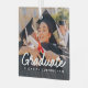 Design is composed of modern playful typography with serif font. Add a custom photo of the graduate, name and year.