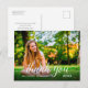 This graduation thank you postcard features a custom photo frame that fills the entire front. Modern calligraphy text "thank you" appears in white on top of the photo. Add you own personal thank you message on the back.
