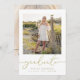 This design features a graduate simple modern stylish invitation announcement card, with an elegant gold typography template, a minimalist trendy classy class of, great for high school college senior photo, with a minimal simple gold and white, grad graduation party invitation, an elegant classic minimalist cards, senior photo picture template, a custom customised graduation card,2 two photo picture template