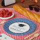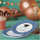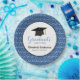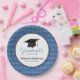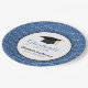 This graduation paper (disposable) plate features a graphic of a graduation hat (mortarboard) and customisable text for: Class of, Graduates Name, Name of School. This paper plate is accented with a white swirl pattern on a blue background.