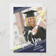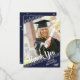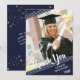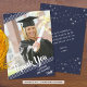 Simple, clean white lines against a navy blue background and muted stars with a brush script title THANK YOU and graduation year accent your graduate's name and one of their photos. The back features a stars pattern and a place to type in a generic thank-you message (you can delete the sample text to leave blank for personal handwritten messages) on a navy blue background.