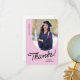 A graduate thank you card featuring a vertical photo with an arched edge. Personalise this light pink and black card with your own message of gratitude or use the one shown.