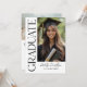 Modern black and white graduation invitation featuring a bold vertical “Graduate” design with a full photo on the front. Personalise with the graduate’s name and class year for a clean, editorial look. Backside includes a photo header plus coordinating grad party details in crisp black type on white.