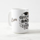 This vibrant and celebratory design features the phrase "Graduated with Honours and Coffee" in bold, playful lettering. The image includes a graduation cap with a tassel at the top, adding a touch of academic achievement. Surrounding the text are whimsical stars and decorative swirls, enhancing the festive feel. At the bottom, a rolled-up diploma tied with a ribbon symbolises the culmination of hard work and dedication. One side of the mug proudly displays the graduate's name, while the other side marks the year of graduation. This design is perfect for a mug, celebrating the accomplishments of graduates who powered through their studies with the help of coffee.