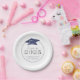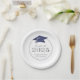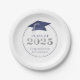 Elegant personalised graduation CLASS OF 2025 graduation party paper plates featuring faux metallic navy blue and silver graduation cap and year with your custom text (shown with CONGRATULATIONS NAME) in navy blue. ASSISTANCE: For help with design modification or personalisation, colour change, resizing, transferring the design to another product or if you would like coordinating items, contact the designer BEFORE ORDERING via the Zazzle Chat MESSAGE tab or email makeitaboutyoustore@gmail.com.