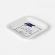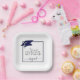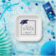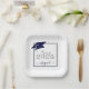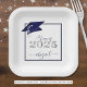 Modern personalised CLASS OF 2025 navy blue, silver and white graduation party plates with your graduate's name in a chic handwritten script with faux metallic navy blue graduation cap and faux metallic silver 2025. ASSISTANCE: For help with design modification/personalisation, colour change, transferring the design to another product or would like coordinating items, contact the designer BEFORE ORDERING via Zazzle Chat or makeitaboutyoustore@gmail.com.