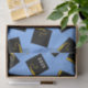 Creative black and gold graduation caps on a light blue background. Edit text to customise for class of 26 grad.