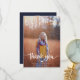 Chic white typography photo overlay, graduation thank you card. Features, full bleed photo on front, graduation cap accent, round photo frame on back with navy blue background colour.