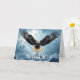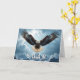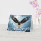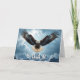 A bald eagle with outstretched wings flies gracefully over a range of snow-covered mountains with SOAR text.