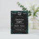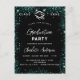A modern, elegant graduation party invitation. A black background decorated with green, teal faux glitter, sparkles. Personalise and add a name, year and details.