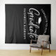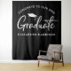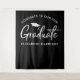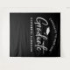 A modern photo booth backdrop tapestry for your graduation. "Congrats To Our Graduate" is written in a mix of simple white typography and a large white script against a black background. Personalize with your name and class year in simple white typography. You can change the colors to your school colors by editing in the design tool.