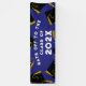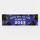 Creative graduation congratulations party banner featuring black and gold graduation caps on blue background. Edit text to change senior class year.