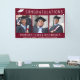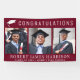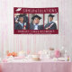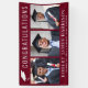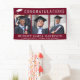 Elegant burgundy red graduation party welcome banner and photo backdrop to celebrate the graduate with "Congratulations" in large white typography and an illustration of a graduation cap, a three photo collage and his or her name, class year and school name in modern white typography. Edit the background and text colours to match your school colours by editing in the design tool.