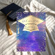Gold graduation cap and diamond frame on a colourful paint splash background.