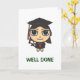 Cartoon Character Graduation Brunette Girl with cap, cloak and certificate wrapped with a red ribbon - Well Done
