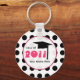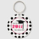 A keychain featuring a background design of black polka dots over white. Text "Class of 2011" with black graduation cap illustration inside pink frame. Personalise with your name.