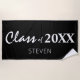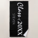 Surprise a high school graduate with a modern design personalised beach towel. This towel is designed with a customisable black background and big white lettering. The front side has "class of" followed by the graduation year and name. Click personalise template option and enter year and name.