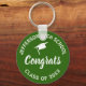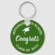 Graduation keychain featuring a white grad cap, the word congrats surrounded by your custom high school name and class of year. The perfect commemorative gift to celebrate the new graduate or an entire graduating class. Current background is green but easily change to match your school colours.