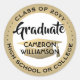Add an elegant personalised touch to college or high school graduation announcements and invitations with these modern calligraphy round stickers / envelope seals. Design features a gold faux foil graduation cap mortar board, and stylish black typography graduate name, school, and class year. Makes a chic customised addition to graduation party favours and decorations. As an option, change the curved text to a name and address for use as round return address labels on invites or thank you notes.