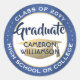 Add an elegant personalised touch to college or high school graduation announcements and invitations with these modern calligraphy round stickers / envelope seals. Design features a blue and gold faux metallic foil and stylish navy and white typography graduate name, school, and class year. Makes a chic customised addition to graduation party favours and decorations. As an option, change the curved text to a name and address for use as round return address labels on invites or thank you notes.