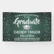 Add a personalised touch to college or high school graduation party decorations with this custom dark green, white and silver banner. All text is simple to customise to include name, class year, school, degree, honours, inspirational quote, or other text of your choice. Design features a green brushed background, faux stainless steel mortar board cap, festive grey and white confetti dots, stylish modern typography, and handwritten style script calligraphy. Please note that silver is printed colour, not metallic foil. This party sign is an elegant way to celebrate the special day. Congratulations to the graduate!