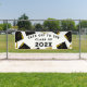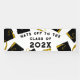 Creative graduation congratulations party banner featuring black and gold graduation caps. Edit text to change senior class year.
