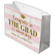 Celebrate your Graduate with this festive gift bag featuring a fun, trendy pink and white striped background and your custom text, accented by faux gold glittery confetti and a gold Grad cap. Perfect for a high school or college graduation gift.