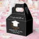 This modern custom senior graduation party favour box features the high school graduate name elegant gold on the chic black background for the class of 2025. Customise with your high school, college, or university name and year for a great graduation keepsake for seniors.