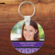 Custom photo and year graduation keychain in elegant and modern plum dark purple, black and white classic floral damask pattern. Add your own photo for a unique grad keepsake or gift.