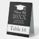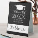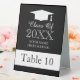 Graduation dinner party table number tent signs. Custom party seating signs. Classy table decor for graduate celebrations. Help people find their table and seats quickly. Black and white design with tassel logo. Chic table decor and decorations. Add your own personalised high school name and class year.