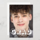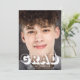 Celebrate your graduate's achievements with family and friends from a safe distance with a drive through graduation party. The front of this modern invite is filled with his or her favourite photo and "GRAD" written in cool large white typography that is partly transparent, and his or her name, school and class year underneath. On the reverse of the invitation you can easily personalise the drive by party details, such as where and when to drive by, gift drop off and treats areas, safety precautions, whether he or she will host a live facebook, instagram or other online event later and where to get more information.