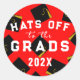 Creative graduation envelope seals, party favour labels or grad gift stickers featuring black and gold graduation caps on school red background.