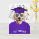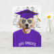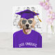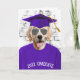 Golden retriever dog in purple t-shirt, aviator sunglasses and purple graduation hat for graduate congratulations.