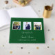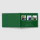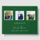 A green background. White coloured text. Personalise and add 3 photos, name, school name and year. For both him and her. The name on the front is written with a hand lettered style script.