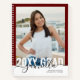 Personalised Graduation Party or Open House Guest Book with Modern Script Name and Class Of Year Overlaid on a Senior Photo on the Front Cover – shown in burgundy red, but you can change the background border colour to match your school colours or grad party colour scheme.