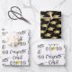 Set of 3 coordinating graduation wrapping paper sheets featuring a repeating pattern of CONGRATS GRAD and CLASS YEAR (editable year) in a hand printed brush stroke typography and a faux metallic gold foil graduation cap or mortarboard in black and white. ASSISTANCE: For help with design modification or personalisation, colour change, transferring the design to another product or if you would like coordinating items, contact the designer BEFORE ORDERING via the Zazzle Chat MESSAGE tab below or email makeitaboutyoustore@gmail.com.