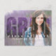 This design features a budget friendly postcard for graduation graduate grad party, modern simple grad typography, with a QR code scan me for your party URL website. with a vellum photo text overlay, a high school or college senior,2 two photo layout templates, graduation grad party invitations, with a clear transparent font overlay, photo graduation announcements, double-sided grad photo cards, a unique cool modern contemporary style