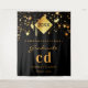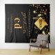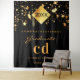 A chic black background. Decorated with golden stars and a modern, abstract faux gold cap, hat, tassel topper with the year inside. Text: Congratulations! and Graduate. Personalise and add a year, monogram initials, name and school name. For both him and her. A banner , party decoration, or photo booth, backdrop for a 20xx (or any year) graduation party.