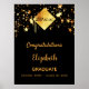 A chic black background. Decorated with dripping golden stars and a modern, abstract faux gold cap, hat, tassel topper with the year inside. Personalise and add a name, school name/year. The text: Congratulations and the name are written with a large modern hand lettered style script. A welcome poster for a graduation party.
