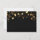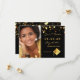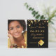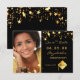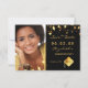 On front: Add your own vertical size photo of the graduate. A chic black background colour, decorated with faux gold stars. Personalise and add a name and date. Golden letters. The name and the text: Save the Date are written with a modern hand lettered style script.