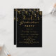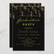 A modern and stylish invitation for a 2023 graduation party. For both him and her. A classic black background and golden and black party streamers as decor. Personalize and add a name and party details. The text Graduation and the name are written with modern handlettered style script. Golden letters.