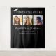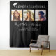 Modern black graduation party photo booth backdrop tapestry with "Congratulations" in white typography and an illustration of a graduation cap on top, a three photo collage, her name in a stylish white script, and her class year and school name in simple white typography. The colours of the background and typography can be edited to your school colours by selecting "edit in the design tool."
